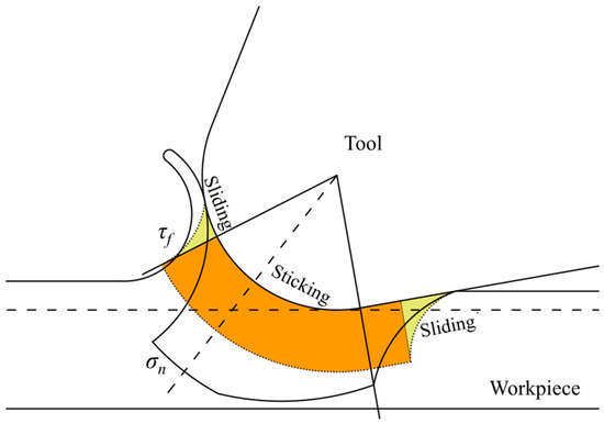 The friction between the tool and the workpiece material is a crucial parameter influencing the MUCT in micro-cutting and affects the generation of frictional heat during the cutting process. Based on the chip formation process in machining, Zorev [30] divided the interaction area between the tool and chip into a sticking region and a sliding region. In micro turning, the locations of the sticking and sliding regions differ from those in conventional cutting; Moon et al. [31] determined the distribution of the bonding and slip zones in the tool corner region based on the material’s plastic flow velocity and the distribution of shear contact forces. This study establishes a cutting friction model based on these two regions to better reflect the friction characteristics in micro-cutting, as illustrated in Figure 3.