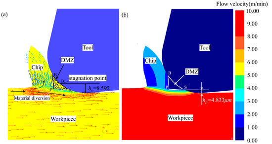 Figure 5a shows the nodal velocity of the material during the micro-cutting process, which can be used to illustrate the flow of the material, and the length of the line segment of the arrow represents the magnitude of the motion velocity. It can be seen that the workpiece material diverges close to the tool edge fillet, and a part of the material moves at a reduced velocity and flows upwards to form chips; a part of the material flows downwards along the tool edge radius to form the machined surface. According to the MUCT prediction formula based on stagnation point O proposed by Son et al. [7], we calculated that the MUCT is 7.909 μm, measuring the simulation results of the stagnation point O to the bottom of the tool distance to obtain the MUCT based on the stagnation point O, hO = 8.592 μm. The simulation UCT of 5 μm is obviously smaller than the hO, and from Figure 5a, we obviously see that the cutting process has a stable chip generation, so the accuracy of the MUCT of Ti-6Al-4V determined by the stagnation point O is relatively low.