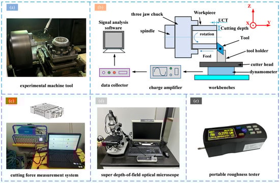 Experiment system and experimental equipment: (a) experimental machine tool; (b) cutting experiment procedure; (c) cutting force measurement system; (d) super depth-of-field optical microscope; (e) portable roughness tester.