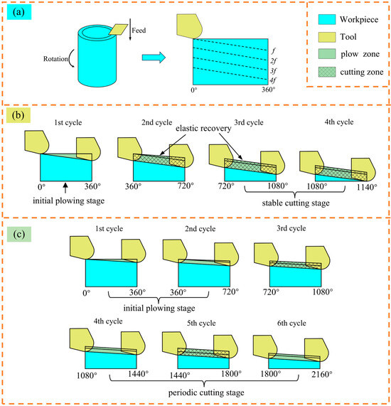 In the micro turning process, chips are generated at feeds greater or less than MUCT, and complete strips of chips are generated continuously at feeds greater than MUCT, and incomplete, shorter, and irregular chips are generated intermittently at feeds less than MUCT so that the MUCT can be analyzed by the morphology of the chips [15]. The chip generation process of this experimental scheme can be simplified as a multi-cycle cutting process, as shown in Figure 9a. When UCT is equal to MUCT, it enters the stable cutting stage after one cycle of the plowing stage, forming complete strip chips, as shown in Figure 9b; when UCT is smaller than MUCT, it enters the periodic cutting stage after a certain cycle of the plowing stage, and the cutting process will be cyclic in plowing cutting and shearing cutting, forming incomplete or irregular chips, as shown in Figure 9c.
