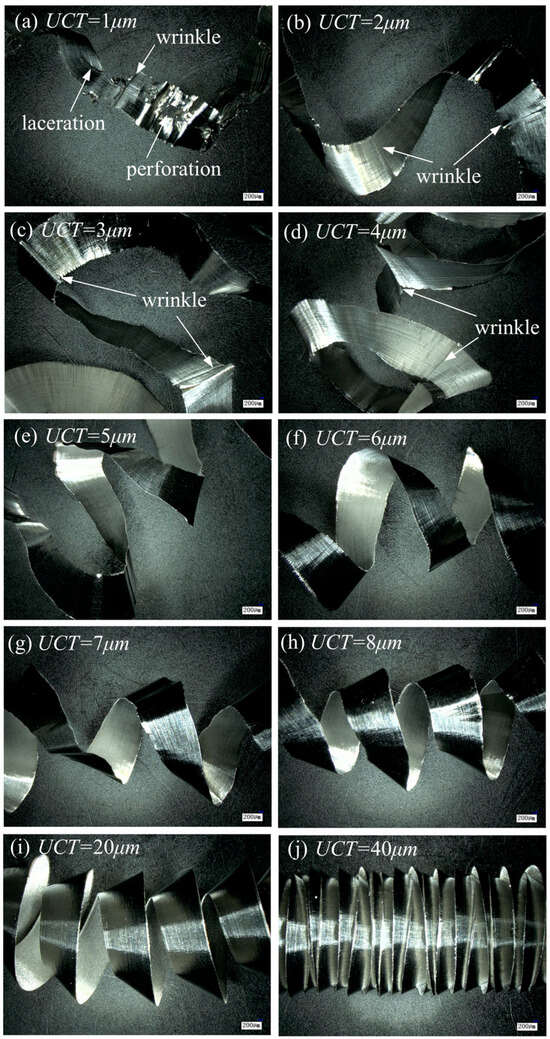 From Figure 10a–j, it can be found that with the increase in UCT, the curl radius of the chip decreases gradually, and the pitch of the chip helix decreases gradually. This is because, during cutting, a significant amount of cutting heat is transferred to the chips, with the highest temperature at the tool–chip interface. The chip thickness increases with a higher UCT, creating a higher temperature gradient across the chip’s surfaces. Consequently, the material on the chip side in contact with the tool undergoes greater expansion than the opposite side, resulting in chips with higher curvature [33].