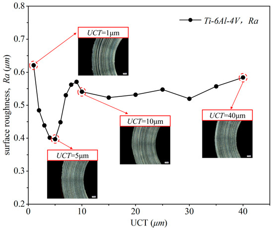 The researchers [15,33] also used the surface quality of the machined workpiece to evaluate the MUCT. They found that when the UCT equals the MUCT, the surface roughness reaches a local minimum. Therefore, this study utilizes surface quality to analyze the MUCT and further validate the simulation results. The effect of different UCTs on the surface quality of the machined surface is shown in Figure 11. As illustrated, when the UCT is low, surface roughness increases as UCT decreases. This differs from the results observed in traditional cutting processes. The reason for this is that when UCT is below MUCT, only a small amount of material is removed in cycle 1. In the next cycle, UCT accumulates until it reaches MUCT, at which point a large amount of chips starts to form, as seen in cycles 1–3 in Figure 9c. As UCT decreases, the cutting process involves multiple cycles 2 until the accumulated UCT reaches MUCT. This makes the initial plowing phase longer, and increases the number of plowing cycles in the periodic cutting stage (cycles 4–6 in Figure 9c). The plowing effect creates scratches on the workpiece surface, which reduces surface quality [34]. Therefore, as UCT decreases, more plowing cycles occur, leading to more scratches and poorer surface quality.
