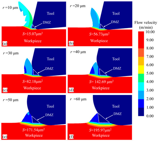 Figure 14 shows the material flow velocity contour for the workpiece under different tool cutting edge radii at the same simulation steps. Observing the chip morphology in front of the tool’s rounded edge, it can be seen that as the tool edge radius increases, the chip thickness gradually increases, but the chip volume decreases and eventually nearly no chips are generated. Additionally, as the tool edge radius increases, the geometry of the DMZ changes significantly. The rake angle (γ), relief angle (δ), and area of the DMZ were measured, with the results shown in Figure 15. It can be observed that with increasing tool edge radius, the relief angle of the DMZ gradually increases, while the rake angle (γ) gradually decreases, eventually becoming a negative rake angle. This makes it more difficult for the material to flow upward to form chips, resulting in more material accumulation in front of the rounded edge. The accumulated material faces greater difficulty in bypassing the DMZ to form chips; consequently, more material flows into the DMZ and becomes part of it, leading to a rapid increase in the DMZ area.