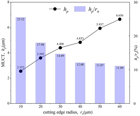 - The tool cutting edge radius significantly influences both the DMZ and MUCT. As the tool cutting edge radius increases, the DMZ area and MUCT increase as well. Furthermore, the hp/rn value varies with the tool’s cutting edge radius rather than remaining constant, decreasing as the cutting edge radius increases.