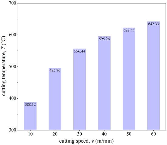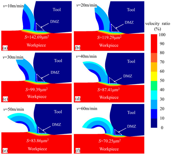 Figure 17 presents the material flow velocity contour of the workpiece at different cutting speeds for the same simulation steps. The DMZ area was measured and calculated for each tool cutting edge radius. When the cutting speeds v were 10 m/min, 20 m/min, 30 m/min, 40 m/min, 50 m/min, and 60 m/min, the DMZ areas were 142.69 μm2, 119.29 μm2, 99.39 μm2, 87.41 μm2, 83.86 μm2, and 70.25 μm2, respectively. It was observed that with increasing cutting speed, the DMZ area gradually decreased. Figure 18 shows the average cutting temperature in the cutting deformation zone during the cutting process. It can be found that with the increase in cutting speed the cutting temperature in the cutting deformation zone gradually increases, and the increase is gradually reduced. The increase in cutting temperature will have a softening effect on the material, reducing the difficulty of shear deformation so that more material forms chips, resulting in a reduction in the DMZ.