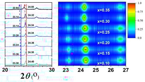 In Figure 2, the XRD pattern of WO3 embedded with Li+ was plotted with details of the peak position change near 24–25°. Contour plots make it more obvious to observe changes in the peak position, peak value, and half-peak width of the plots. By comparison with the JCPDS card No. of 18–0376, the peak at 24.54° corresponds to the (200) crystal plane. As the value of x increases, the peak position is shifted towards a small angle. It decreases from 24.54 to 24.32°. According to Bragg’s Law [31], the insertion of Li+ increased the sample cell volume from 423.6 to 434.4, an increase of 2.5%. This results in compressive stress after the sample has been colored [32,33,34].
