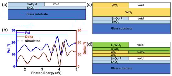 The model of (a) the FTO substrate and (b) the fit result of it. The model of (c) γ-WO3 films on the FTO substrate and (d) LixWO3 films, respectively.