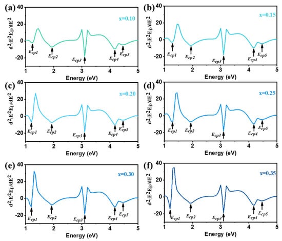 Using the Second derivatives of the pseudo dielectric function numerically calculated spectra of LixWO3 (blue) thin films at 300K. The Ecp1, Ecp2, Ecp3, Ecp4, and Ecp5 transition features are indicated by arrows. (a–f) is the calculated spectra of LixWO3 for x = 0.10, x = 0.15, x = 0.20, x = 0.25, x = 0.30, x = 0.35, respectively.