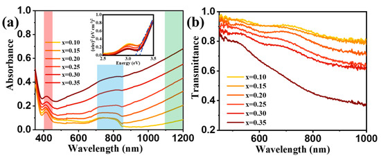 (a) The absorption and (b) transmission spectra for different values of x. The illustration is the optical bandgaps by simulated. Absorption peaks in the red area is attributed to the absorption of W (VI) (d0). Absorption peaks in the blue area is attributed to the absorption of W (V) (d1). Absorption peaks in the green area is attributed to the absorption of W (IV) (d2).