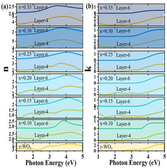 We also obtained the entire optical and dielectric constants of the film for different values of x. As a result of the fits, the imaginary part of the dielectric function (ε2 = 2 nk), which represents optical absorption, is composed of two parts. Figure 8 shows the complex optical constants of the LixWO3 film for different x values (the refractive index, n, and extinction coefficient, k). The yellow line is the n and k for γ-WO3 with the value of 0.1 to 0.35 in layer 4. Due to the diffuse reflective influence of the roughness layer, there will be a slight difference from γ-WO3, but the overall trend is the same. The refractive index is relatively high in the vicinity of 3–5 eV, i.e., its refractive index is higher in the near UV-blue band at 248–413 nm. There are also smaller shoulder peaks near 1.8 and 2.8 eV, suggesting that it also has a relatively high refractive index for peaks near 450 nm and 690 nm.