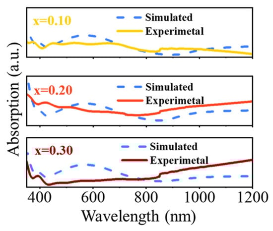 Simulated and experimental absorption coefficient spectra of thin films on the FTO substrate in the visible region with x = 0.10, 0.20, and 0.30.