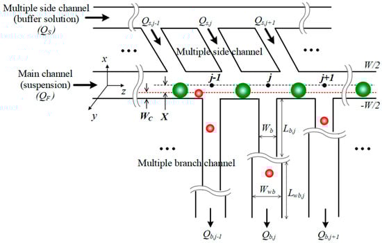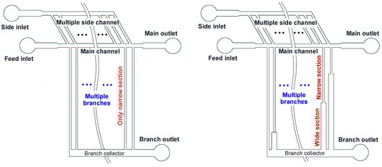 As one of the passive sorting techniques, hydrodynamic filtration (HDF) has been shown to effectively either separate or isolate rigid particles and deformable living cells by differences in size [14,18,19,21,22]. The mechanism of HDF is comparable to conventional crossflow filtration such as nanofiltration, ultrafiltration, and microfiltration. Here, suspended cell particles are continuously introduced into the main channel and well-designed branch channels perpendicular or tangential to the main channel remove the feed suspension. Branch channels function similarly to membrane pores, whether they are arranged in an ordered or disordered type. The multiple branches play a role in particle focusing closer to the sidewalls of the main channel, ensuring that only the stream near the sidewall enters the branches. Considering the additional contribution of the side channel in particle focusing, the selective extraction of streamlines caused by side channel flow is controlled by the flow fraction at each branch for sorting. It is pointed out that a single side channel has been designed in all previous studies. In such cases, the flow focusing tends to weaken towards the end of the main channel, providing a reduction in sorting efficiency. This behavior can also occur when a viscoelastic fluid is introduced. From the design viewpoint to solve this problem, the flow focusing can be maintained at all points of the main channel by introducing multiple side channels, as displayed in Figure 1.
