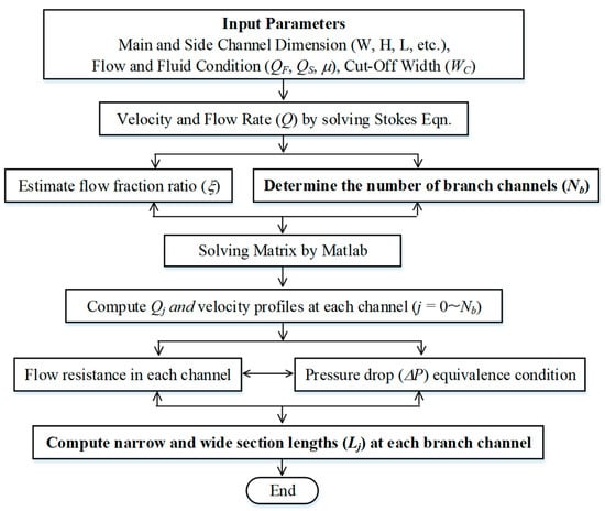 Figure 3 presents the overall algorithm employed in this study. Objective parameters for optimum designing are the number of branch channels and each length of individual branch channels. The number of branches can be determined based on a criterion involving a constant residence time of suspended cell particles traveling in the channel network. The residence time is represented by the longest traveling time through the last branch with the lowest flow velocity, under the same throughput. Detailed information can be found in the previous study [21]. While increasing the number of branches improves the selectivity of cell particles, it undesirably results in a larger chip size.