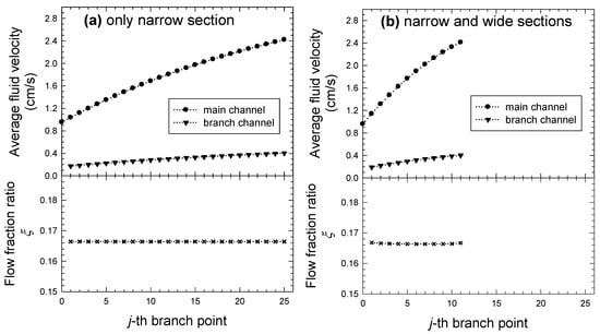 Two cases are considered as the branch channels formed by only a narrow section as well as a branch channel formed by wide and narrow sections. Figure 4 illustrates the average velocity in the main and branch channels, computed at each branch point, along with the flow fraction ratio estimated from these values. The number of branch channels is obtained as 25 for the case with only a narrow section (Figure 4a), and 11 for the case with narrow and wide sections (Figure 4b). The average velocity increases in the main and branch channels as the branch point becomes larger (i.e., towards the downstream position of the main channel), regardless of the presence of a wide section. This behavior is evidently different from the case of a single side channel. The velocity increase is due to the continuous replenishment of fluids from multiple side channels having the same number of branch channels, as it goes to the downstream position of the main channel. The degree of velocity increase is about 260% in the main channel and about 200% in the branch channel, indicating a greater increase in the main channel. These results imply that the depletion of main flow never occurs, even at the end of the main channel, which is also confirmed by the result of a constant flow fraction ratio. Furthermore, it means that the cut-off width assigned in the main channel can be maintained consistently from the start to the end of the main channel.