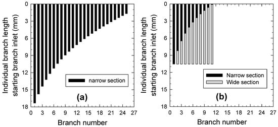 Figure 5a and Figure 5b show the computed lengths of each branch channel for the two cases described above. In the case with only a narrow section, the first branch channel has a maximum length of 17.4 mm and the branch channel becomes monotonically shorter as it goes downstream. In comparison, in the case with both narrow and wide sections, the length of the narrow section decreases toward the downstream branch channels, while the length of the wide section increases accordingly, resulting in a constant total length of 10.5 mm for all branch channels. It should be noted that applying a wide section in the branch channel offers the advantage of sorting with a simplified and compact channel design, characterized by fewer and shorter branch channels.