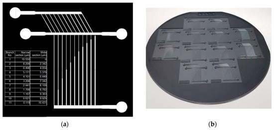 (a) A layout of photomask for fabricating a microfluidic-chip designed with multiple side and multiple branch channels consisting of narrow and wide sections to sort out bidisperse particles, where detailed dimension values are given in Table 1; (b) picture of master mold fabricated by MEMS process.
