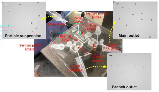 The experimental setup for the prototype of our sorting is demonstrated in Figure 7. Switching valves were adopted to operate conveniently in either separation mode or collection mode. Separated particles were collected from each outlet, and their numbers could be counted by analyzing the images. Figure 7 shows the microscopic views of particles before separation and recovered from each outlet, where small and large particles were collected from the branch outlet and main outlet, respectively.