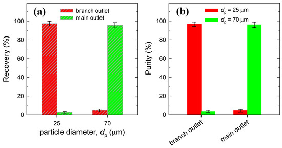 As is presented in Figure 8a and Figure 8b, the recovery and purity can be estimated by counting the number of particles collected from each outlet with the sample volume, accessing sorting efficiency or performance. Samples from each outlet were loaded onto a hemocytometer by using a pipette, where a cover slide was placed to ensure uniform distribution of the suspension, and then microscope images of particles within the defined counting grids were captured. Using the ImageJ software mentioned above, particles falling within a size range were categorized and counted accordingly. The recovery is defined as the ratio of the number of target particles collected from a particular outlet to the total number of target particles in the sample collected from all outlets, providing information as to which outlet a particular particle is collected from. The purity is the ratio of the number of target particles to the total particle number in the collected sample at each outlet, representing which particles are more prevalent at each outlet. If the particle radius is larger than the cut-off width of 33 μm, it flows through a main channel. On the basis of this condition, small (25 μm) and large (70 μm) particles were collected almost always from the branch outlet and main outlet with a recovery of ca. 97% and 95%, respectively. Populations of small and large particles were collected in the purity of ca. 96% and 96% from the branch outlet and main outlet, respectively.