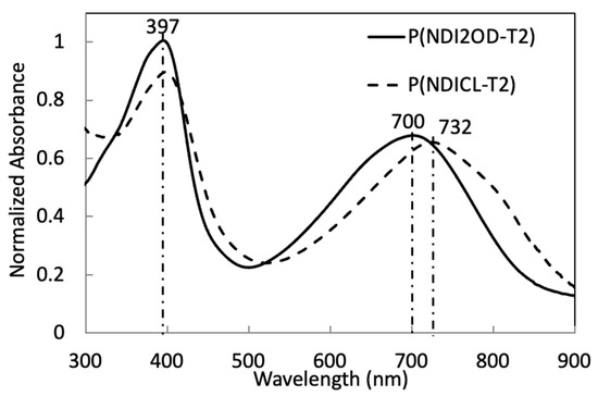 Film UV-vis spectra of P(NDI2OD-T2) and P(NDICL-T2). Films were spin-coated at 1000 rpm for 60 s from a 40 mg/mL chlorobenzene solution filtered through a 0.45 µm membrane filter, on 2.5 cm × 2.5 cm glass plates.