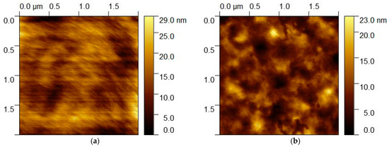 AFM height images (2 μm × 2 μm): (a) P(NDI2OD-T2) (RMS = 3.929 nm); (b) P(NDICL-T2) (RMS = 3.127 nm). Films were formed via the same procedure as UV-vis on 2.0 cm × 2.0 cm silicon probes (resonant frequency ≈ 300 kHz, force constant ≈ 26 N/m, Olympus OMCL-AC160TS).