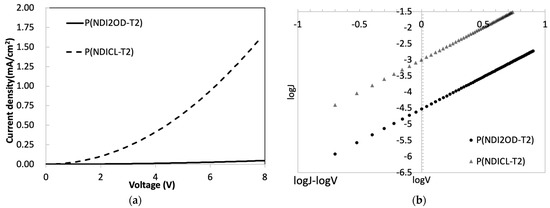 (a) Current density-voltage characteristics for electron-transporting devices based on P(NDI2OD-T2) and P(NDICL-T2); (b) double logarithmic plots characteristics for electron-transporting devices based on P(NDI2OD-T2) and P(NDICL-T2). Films were fabricated via the same procedure as UV-vis on 3.0 cm × 3.0 cm ITO substrates.