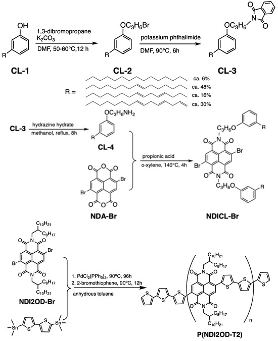 The process began with the synthesis of cardanol derivatives (CL-2, CL-3, and CL-4), followed by the polymerization of NDI derivatives using Stille coupling reactions.