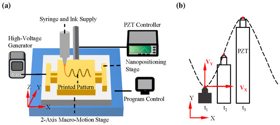 The fundamental configuration of the device is illustrated in Figure 1a, which depicts the integration of essential components, including a high-voltage generator, a spinning nozzle, and a motion-programmable receiving platform. Additionally, a micromotion platform based on a flexible mechanism has been designed and integrated, which represents a significant advancement over conventional NFDW systems. The majority of direct-writing systems currently in use directly employ commercial printing platforms. While these platforms are capable of achieving significant stroke displacement, their printing accuracy is typically limited to 100 μm, due to cost considerations [41]. This is insufficient for the scaling requirements for microstructure fabrication. In contrast, the resolution of PZT actuators can reach the nanometer level, offering a potential avenue for improving the printing accuracy by an order of magnitude. The longitudinal motion of the jet is regulated by a vertical electric field applied to the nozzle, while the transverse trajectory is controlled by the micromotion platform and the 2D macro-motion platform, respectively. This control strategy combines the substantial stroke displacement of the macro-motion platform with the precision micromotion of the PZT-driven platform, significantly simplifying programming control. Figure 1b illustrates the principle of trajectory synthesis, where the red dot and dotted line represent the moving point of the PZT and the moving track composed of the moving point, respectively. During the transverse uniform displacement of the macro-actuated platform, the PZT-driven micro-actuated platform produces electro-induced pulse micro-displacement in the orthogonal direction, and its mathematical expression is shown in Equation (1).