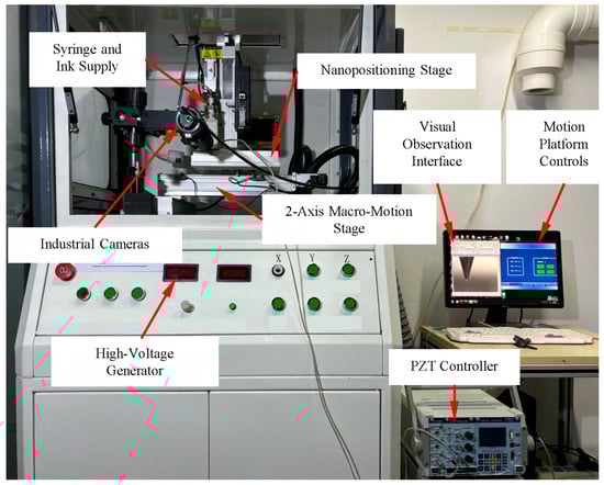 A custom-built electrospinning system was developed to achieve precise control over the fiber trajectories, as shown in Figure 2. The performance parameters of the micromotion platform are detailed in Table 1. The PZT actuator (PSt150/7/100VS12, Harbin Core Tomorrow Technology, Inc., Harbin, China) used in the experiments has a nominal stroke of 95 μm and a displacement resolution of 7 nm, with a theoretical micro-displacement exceeding 290 μm. Operated in a closed-loop system with a self-contained controller, it offers various drive modes (sinusoidal, triangular, etc.), selectable through the control interface. The polymer melt was controlled via an electrical heating system around a syringe, with the precise polymer supply regulated by a pneumatic pump. ITO conductive glass, chosen for its low surface resistance and smooth flatness, serves as the substrate for fiber collection. A constant high voltage was applied to the needle by a high-voltage supplier (DW-N303-100ACC2, Tianjin Dongwen High-Voltage Power Supply, Inc., Tianjin, China). The entire printing process was monitored and recorded using a CMOS camera (DMK33UX265, The Imaging Source, Inc., Bremen, Germany).