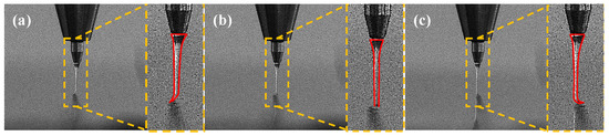 To generate specific waveforms, electrical signals were applied to the PZT actuator. Modulating the input signals caused corresponding changes in the PZT actuator’s behavior. This precise control governs the degree of meandering and the shape of the pattern deposition trajectory. As shown in Figure 3, applying electrical signals such as sine, square, or triangular waves enabled the observation of lateral jet vibrations driven by PZT micro-actuation, where the motion profile of the jet is depicted with a red frame.