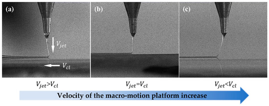 In the NFDW process, the voltage is crucial. Increasing the voltage intensifies the jet’s erratic oscillation, posing challenges in terms of direct control. Therefore, a narrower electrode spacing (typically 2 mm or less) is preferred, to minimize the voltage and prevent instability. Lower pressures enhance morphology control but lead to the risk of supply interruption, while higher pressures may cause melt suspension. The stability of the volume of the Taylor cone in the spinning process can be used as a criterion in regulating the air pressure. Subsequently, harmonizing the voltage with the platform collection velocity emerges as the linchpin for stable and controllable fiber trajectories. Figure 4 illustrates the alignment mechanism and shows that, whenever the platform velocity is less than that of the jet (i.e., >), then axial compression and bending cause “telephone line” or irregular wave-type fiber deposition. Conversely, when it matches the jet speed (i.e., =), minimal jet deflection ensues, signaling the pivotal phase for optimal direct-writing controllability. If the platform speed surpasses the jet speed (i.e., <), then a “hysteresis effect” induces excessive fiber stretching and straightening. Higher platform acceleration is recommended to mitigate non-linearity in platform motion and jet instability. Based on the aforementioned discussion, the spinning parameters for this experiment are shown in Table 2. Subsequent experiments will incorporate these data under standard room temperature and atmospheric pressure conditions.