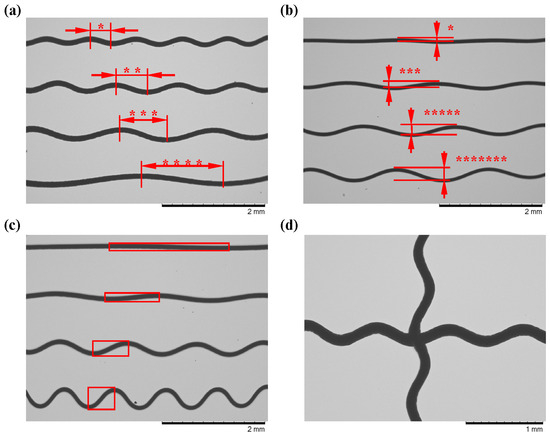 Prior to investigating the impact of the printing parameters on the deposition pattern, we conducted a preliminary assessment to ascertain the viability of modulating the serpentine structure’s parameters through alterations to the PZT. The results are presented in Figure 5. Figure 5a illustrates the outcomes of modifying the input frequency in accordance with the 1:2:3:4 ratio. Figure 5b depicts the consequences of altering the amplitude in alignment with the 1:3:5:7 ratio, and Figure 5c presents the results for modifying both the frequency and the amplitude simultaneously. It is evident that the trends in the amplitude and period of the fibers exhibit a high degree of uniformity and consistency with the changing trends in the input parameters. Furthermore, Figure 5d illustrates the potential for this technique to be extended to multi-directional printing.