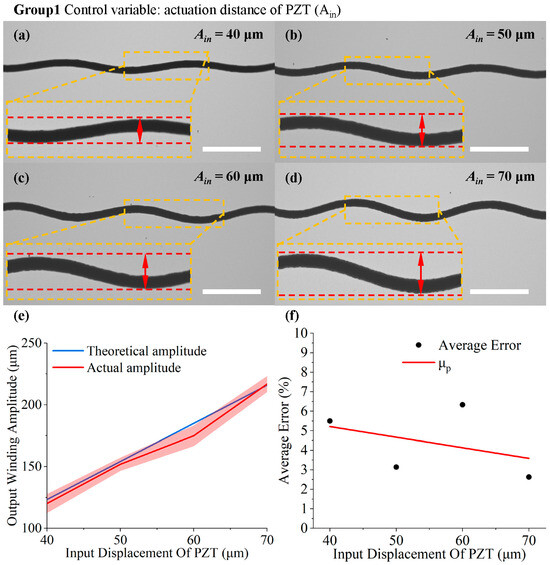 The experimental results for varying amplitude input: (a–d) deposition waveforms when the output displacement of the PZT rises from 40 μm to 70 μm with a step size of 10 μm (the scale bar is 1 mm); (e) the measurement results for the peak height of the fiber varying with the input displacement; (f) error analysis and the fitting curve of the average error.
