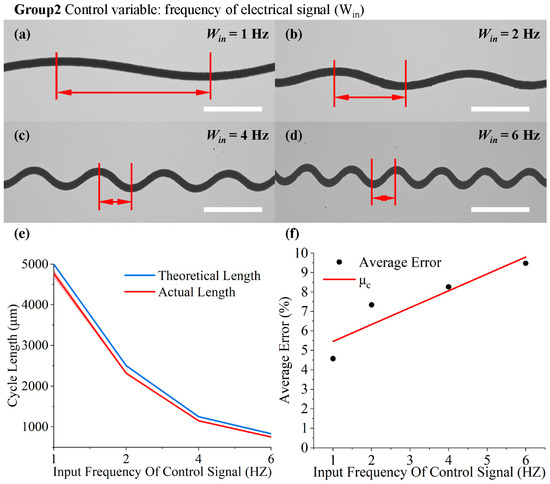 In the second set, Figure 7a–d demonstrate the variation in the wavelength of the serpentine structure with different input frequencies. As shown in Figure 7e, the theoretical and actual values are numerically similar. With the theoretical output frequency of 1, 2, 4, or 6 Hz and the platform speed of 5 mm/s, the theoretical cycle lengths were 5000, 2500, 1250, and 833 μm, respectively. The actual cycle lengths obtained were about 4771.39 ± 94.16, 2316.485 ± 24.78, 1146.75 ± 7.07, and 754.02 ± 4.95 μm, respectively. There was no significant change in speed in the direction of cycle length, indicating that the speed of PZTs did not change in the direction from elongation to contraction, as observed in the first set of peaks, where hysteresis effects predominated. Simultaneously, as the frequency increased, implying more actuations within the same time frame, the PZT actuation speed rose, amplifying the “hysteresis effect”. This amplification increased the error between the actual results and the theoretical values from 4.57% to 9.48%, demonstrating a parallel trend with the frequency. The correction coefficient for frequency was derived from available experimental results: .