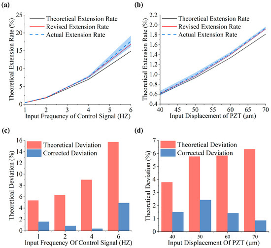 Indeed, the utilization of piezoelectric ceramics as actuators in this study introduces the possibility of thermal effects, environmental factors, and hysteresis characteristics influencing the precision of piezoelectric ceramics’ motion. However, the impact of these discrepancies is relatively minimal, making them challenging to quantify, non-linear, and difficult to circumvent. Consequently, the introduction of the correction coefficient into the calculation model represents a direct and accurate method. By aggregating the potential error into a single correction coefficient, the resulting error coefficient can be utilized to reverse-compensate for the manufacturing errors introduced during the production process. Subsequently, the discrepancy between the theoretical and modified model predictions and the actual lengthening was calculated and analyzed, as shown in Figure 8a,b. The analysis reveals a strong alignment between the actual elongation rates and corrected model predictions. This consistency is observed across varying frequencies and input amplitudes, and the correction falls within the error band for the actual value in all groups, separating it from the theoretical value. To illustrate this, deviations between theoretical, corrected, and actual values were calculated. Figure 8c,d depict the error distribution for the amplitude- and frequency-change groups. Initially, the error distribution for the frequency-change group ranged from 5.34% to 15.73%, while that of the amplitude-change group ranged from 3.79% to 6.33%. After introducing error correction, the model’s computational error was reduced by over 57.86%. The error for the frequency-change group decreased to 0.37–4.90%, while that of the amplitude-change group dropped to 0.85–2.43%. The deviation-corrected results indicate a significant reduction in the discrepancy between the corrected and actual values, with an amplitude decrease ranging from 2.29% to 10.83%. These findings strongly support the accuracy of the theoretical prediction model proposed in this paper and emphasize the necessity of incorporating error correction factors.