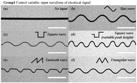 Deposition waveforms with varying input electrical-signal waveforms: (a) no input; (b) sine wave; (c) square wave; (d) square wave with variable peak height; (e) sawtooth wave; (f) triangular wave. (the scale bar is 1 mm).