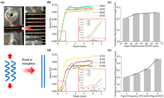 Tensile test results: (a) the schematic diagram of fiber stretching; (b) fiber stress–strain curve under displacement change; (c) length change in the non-linear mechanical region of meandering fiber under displacement change; (d) fiber stress–strain curve under frequency change; (e) length change in the non-linear mechanical region of meandering fiber under frequency change.