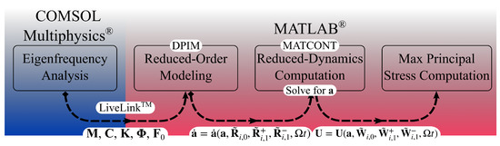 The DPIM method described in Section 2 was adopted to compute the dynamic response of a polysilicon MEMS test structure designed with the goal of leading to stress intensification at the SiO2-polysilicon interface for mechanical characterization purposes. Since full-order models would be excessively time-demanding for the optimization of the shape of the moving structure to maximize the mentioned stress intensification, the model-order reduction strategy was implemented in MATLAB® R2023a [14] and used in conjunction with COMSOL Multiphysics® 6.2 [15] through the MEMS module and LiveLink™ for MATLAB®. The steps of the numerical procedure are illustrated in Figure 1 and can be briefly explained as follows. The nonlinear mapping and reduced velocity coefficients are first obtained, adopting a normal form parametrization to derive the reduced velocity coefficients (see [11]). The reduced-order dynamics is integrated in time by using an orthogonal collocation method with path length continuation, such as MATCONT [16]. The motion of the physical reference system is retrieved through Equation (11). Finally, the stress field is computed locally according to the constitutive law; in an FE analysis, this is carried out at the Gauss points.