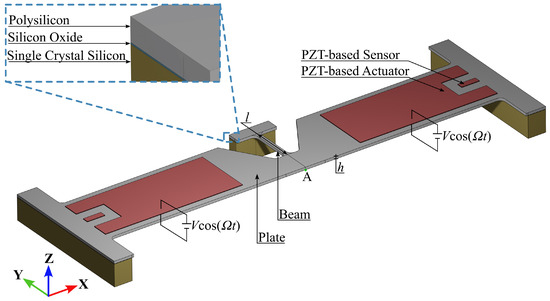 The reference geometry of the test structure is shown in Figure 2, as designed in partnership with ST Microelectronics and Politecnico di Milano. The mechanical backbone is represented by a film of poly-crystalline silicon (termed plate in the figure), constrained at the two ends by massive anchors. The central portion of the plate is shaped to reduce its bending stiffness and to allow a flexible beam to be moved at one end in the out-of-plane direction (upward in the figure) whenever the plate is actuated. The PZT patches on top of the silicon layer serve to actuate (in the case of the larger ones) according to 3-1 mode piezo-mechanical coupling [1,17] or to sense the induced motion (in the case of the smaller ones).