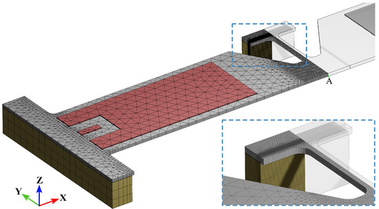 where the i-th mechanical eigenmode and is a load multiplier, evaluated for each electrical eigenmode and determined by the surface charge collected at the top surface of the PZT layer where the electric potential V is applied. Given the symmetries in the geometry and actuation, only the first m symmetric modes are considered in the analysis. Therefore, only half of the device is discretized, as shown in Figure 3, to further reduce the computational burden, and 15 nodes, quadratic elements, are employed. The reported mesh was obtained as a result of a preliminary convergence analysis to assure it would be sufficiently fine to accurately capture the stress field in the region of interest.