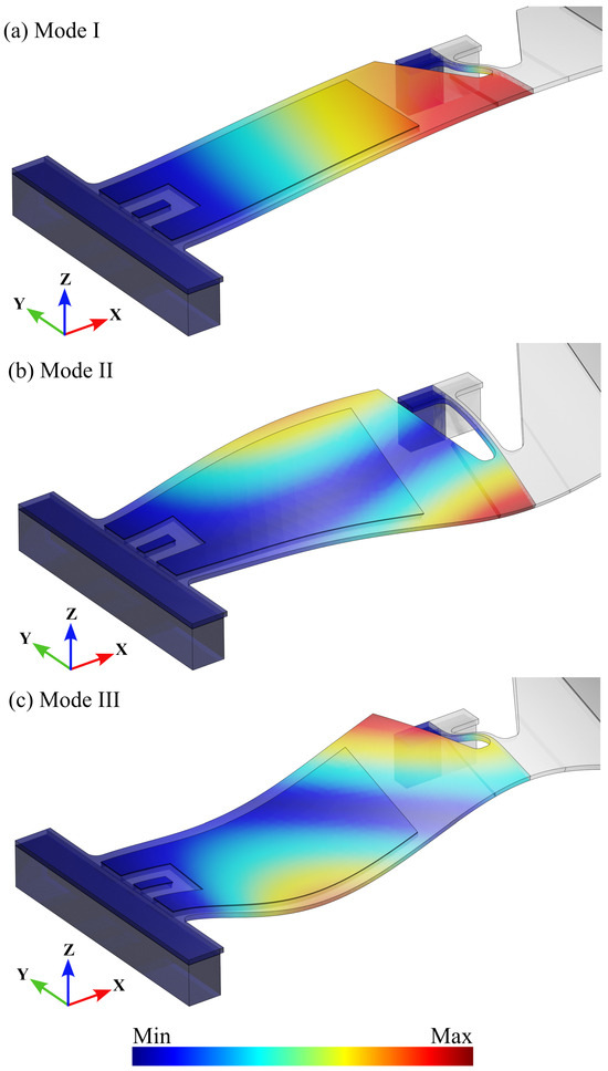 (a) First, (b) second, and (c) third fundamental eigenmodes of the test structure, plotted in terms of the amplitude of the mass-normalized displacement.