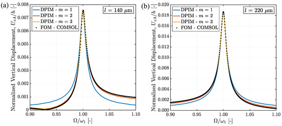 The results of the DPIM-based procedure relevant to the two beam lengths m and m are shown in Figure 5. In the charts, the FRCs are displayed at varying order m of the ROM and are compared to the FE solutions. The displacement of point A is normalized by way of the silicon film thickness h to allow for the assessment of how good the DPIM-based solutions are in dealing with the geometrical nonlinearities. All in all, the plots demonstrate that relative to the FE results, the proposed solution converges for , independently of the beam length. For this convergence analysis, and are specifically set.