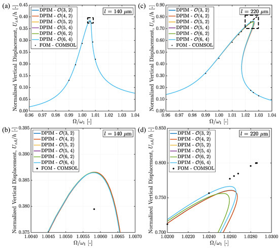 By adopting the same beam lengths examined in Section 3.1, the FRCs in Figure 6 are reported at varying orders and and compared with the FOM solutions. As shown in Figure 6c, the structure with m exhibits a larger ratio than the structure with m (see Figure 6a), due to the higher compliance of the beam linked to its slenderness.