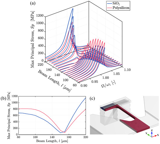 (a) Effects of beam length l and excitation frequency on the maximum principal stress values in the polysilicon film and in the silicon dioxide layer. (b) The largest values of the maximum principal stress extracted at each beam length. (c) Domain where the stress has been computed, wherein the blue region marks the silicon dioxide area, while the red one is the polysilicon region.