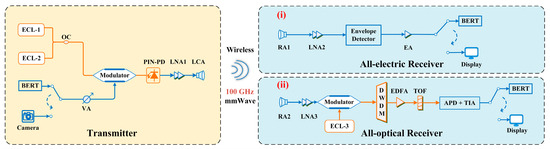 The millimeter-wave (mmWave) band has garnered significant attention for its high bandwidth efficiency, low latency, and ability to meet the demands of emerging bandwidth-hungry applications [1,2]. At the transmitting side of mmWave wireless communication systems, to convert the baseband data signal into the mmWave frequency band, there are typically two technical approaches to achieve mmWave up-conversion. One is the all-solid-state electronic mixing technique, and the other is the photonics-assisted heterodyne beating technique. The photonics-assisted technique leverages the advantages of optical devices, such as their wide bandwidth and high-frequency response, which has demonstrated potential in overcoming the limitations of conventional electronic devices, enabling ultra-wideband communication with higher data rates and better transmission performance [3]. In addition, mmWave up-conversion based on the photonics-assisted technique has been widely used due to its convenience in facilitating fiber-wireless-fiber (FiWiFi) convergence. At the receiving side of mmWave wireless communication systems, all-electric receivers based on envelope detection and all-optical receivers are two main categories for mmWave down-conversion approaches. Unlike all-electric receivers based on monolithic microwave integrated circuit (MMIC) technology, the all-electric receiver based on envelope detection does not require the generation of a local oscillator signal related to the mmWave carrier frequency. The core task of the envelope detector is to determine the amplitude variations of the intensity-modulated signal. Meanwhile, this approach avoids complex frequency synthesis or mixing operations, making it suitable for low-complexity scenarios. In contrast, the all-optical receiver employs an ultra-wideband mmWave electro–optic modulator to directly modulate the received mmWave signal onto the optical carrier. Subsequently, an optical band-pass filter filters out one of the sidebands as the optical baseband signal [4,5].