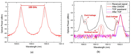 Figure 3 shows the architecture of the transmission system in this work. The transmitter employs the photonics-assisted heterodyne beating technique to modulate the OOK signals generated by the BERT or the real-time data stream of a camera onto the optical carrier, thereby generating and transmitting millimeter-wave signals. The receiver is implemented via two approaches: (i) an all-electric receiver based on envelope detection and (ii) an all-optical receiver based on an avalanche photodiode. The measured optical spectrum after the modulator at the transmitting side is shown in Figure 4a; the measured optical spectra of the received signal after the modulator, dense wavelength division multiplexing (DWDM), the tunable optical filter (TOF) in the all-optical receiver, and the passband of TOF are shown in Figure 4b. The parameters of key components used in the experiment are provided in Table 3.