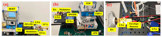 Photos of the indoor transmission system: (a) transmitter, (b) all-electric receiver, (c) all-optical receiver.