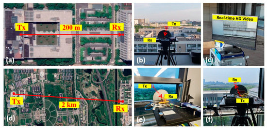 Experimental setup of the outdoor transmission: satellite map of the transmission link over a distance of (a) 200 m and (d) 2 km. Photos of the receiving side of (b) 200 m and (e) 2 km transmission. Photos of (c) real-time HD video displayed on the screen and (f) the transmitting side of 2 km transmission.