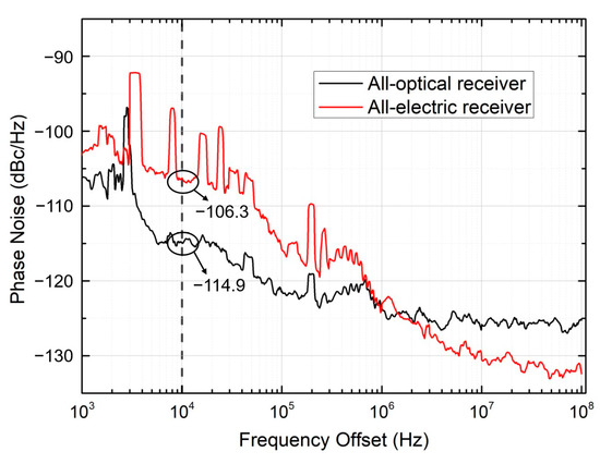 To investigate the underlying mechanisms behind the performance differences between the all-electric receiver based on envelope detection and the all-optical receiver based on APD, the phase noise of the two schemes is measured in our experiment. Figure 7 shows the phase noise as a function of frequency offset. This curve is obtained under the BtB configuration of a 1 GHz sine wave generated by an arbitrary waveform generator (AWG). Within the critical frequency offset range below 106 Hz, the phase noise of the all-optical receiver is significantly lower than that of the all-electric receiver. Specifically, in the range of from 10 kHz to 100 kHz, the phase noise of the all-optical receiver is approximately 8 dB lower.