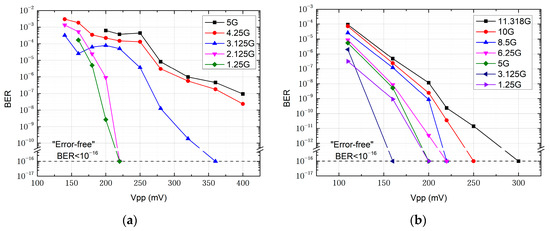 The transmission performance of the two schemes shows significant differences under the influence of phase noise, which is caused by the characteristics of the devices and the system principles. Figure 8 shows the BER as a function of signal amplitude input to the transmitting side intensity modulator for 15 m indoor transmission using the all-electric and all-optical receivers, respectively. For the all-electric receiver, due to the bandwidth limitation of the envelope detector, the receiving side BERT fails to recover the data when the transmission rate exceeds 5 Gbit/s, resulting in a transmission link interruption. In contrast, the all-optical receiver is capable of supporting transmission rates up to the maximum of 11.318 Gbit/s generated by the BERT. Note that the system employing the all-electric receiver achieves error-free transmission of OOK signals up to a maximum of 3.125 Gbit/s, whereas the system using the all-optical receiver is capable of achieving error-free transmission at 11.318 Gbit/s with a signal amplitude of 300 mV. It is worth noting that the aforementioned error-free transmissions refer to long-term stable transmission with no bit errors, as indicated by a bit error rate (BER) lower than the measurable limit of 1 × 10−16 on the BERT, and all experiments are conducted without clock recovery.