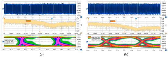 To further evaluate the transmission performance, we also compare the quality of the eye diagrams for the two receiving schemes. Figure 9a,b show the waveform, spectrum, and demodulated eye diagrams for the 5 Gbit/s OOK signal, measured under the all-electric receiver scheme and the all-optical receiver scheme, respectively. In Figure 9a, we configured the oscilloscope to use the First Order PLL method for clock recovery in order to obtain a stable eye diagram; the bit error rate corresponding to the eye diagram is 6.8 × 10−7, making it challenging to achieve live streaming of uncompressed HD videos. Nevertheless, the all-optical receiver can achieve error-free transmission at a rate of 5 Gbit/s, and it can be seen in Figure 9b that the quality of the eye diagram without clock recovery is evidently better than that of the all-electric receiver. However, the rising and falling edges of multiple symbols are also no longer concentrated at a single position in the eye diagrams, appearing more dispersed. Quantitative analysis using an eye diagram analyzer reveals that this phenomenon is closely related to the larger jitter RMS value of 8.88 ps observed in the all-electric receiver, compared to the 7.07 ps jitter RMS in the all-optical receiver. The flicker noise and other factors inherent to the mechanism of the envelope detector are also key factors leading to signal degradation and transmission instability.
